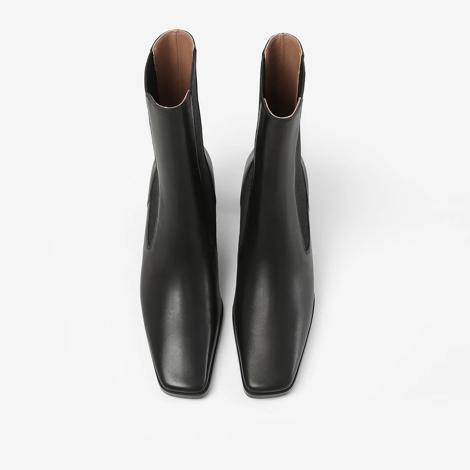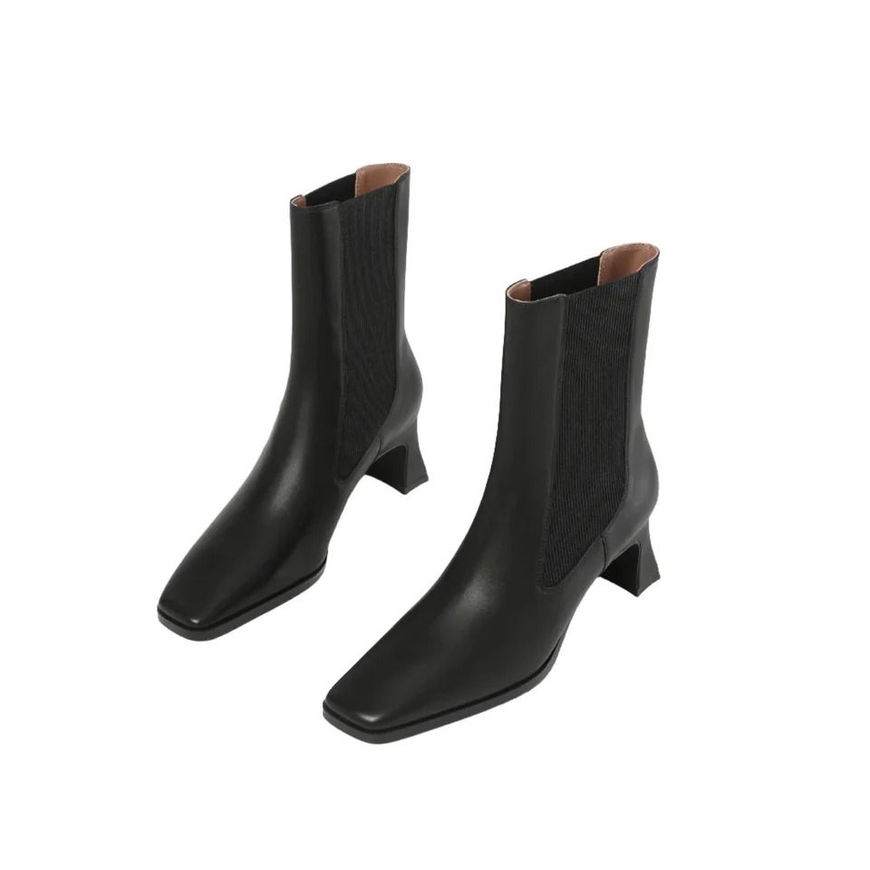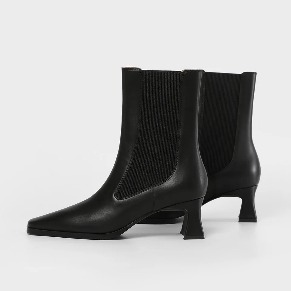 - Slanted square toe with flat slim block heel